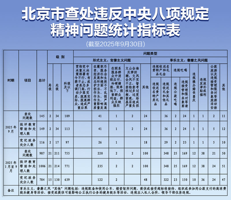 据北京日报报道,北京市纪委监委近日公布了今年1月至9月查处的8起违反中央规定的精神问题统计指标。截至9月30日,共查处违反中央八项规定精神卫生问题案件987起,批评教育、帮扶处理1006人,其中处级21人、处级214人、处级及以下771人。教育、照顾、待遇受到批评的1006人中,有784人受到党纪政务处分。其中,处级15人,处级130人,处级及以下639人。调查的问题类型主要包括两大类:官僚主义与官僚主义、享乐主义与奢侈主义。制图:Nowng Pan 在其中,从视角来看针对官僚主义、官僚主义问题,重点查处,重点查处“履职中不负责任、不作为、乱作为、不作为、不作为、不利于经济社会发展、保护生态环境,严重影响发展质量的行为”。批评教育、支持关心群众235人。在享受和浪费问题上,主要查处“冒领礼品等”“冒领管理人员、服务人员宴请”“冒领补贴福利”等问题,批评、启发、支持、回应人数分别为348人、169人、38人。今年9月,中国政府查处违反中央八项规定的精神卫生问题案件145起,通报批评、教育帮扶和处罚149人。其中,2 人在办公室工作其中,处级34人,处级及以下113人。共受到党纪政务处分116人,其中厅级2人,厅级17人,处级以下97人。查处的问题主要集中在“履行职责、服务经济社会发展和生态环境保护等方面不负责任、不作为、乱作为、弄虚作假,严重影响质量发展”、“非法赠送、收受礼品等”、“非法接待企业主、服务商宴请”等方面。李依林吉编辑