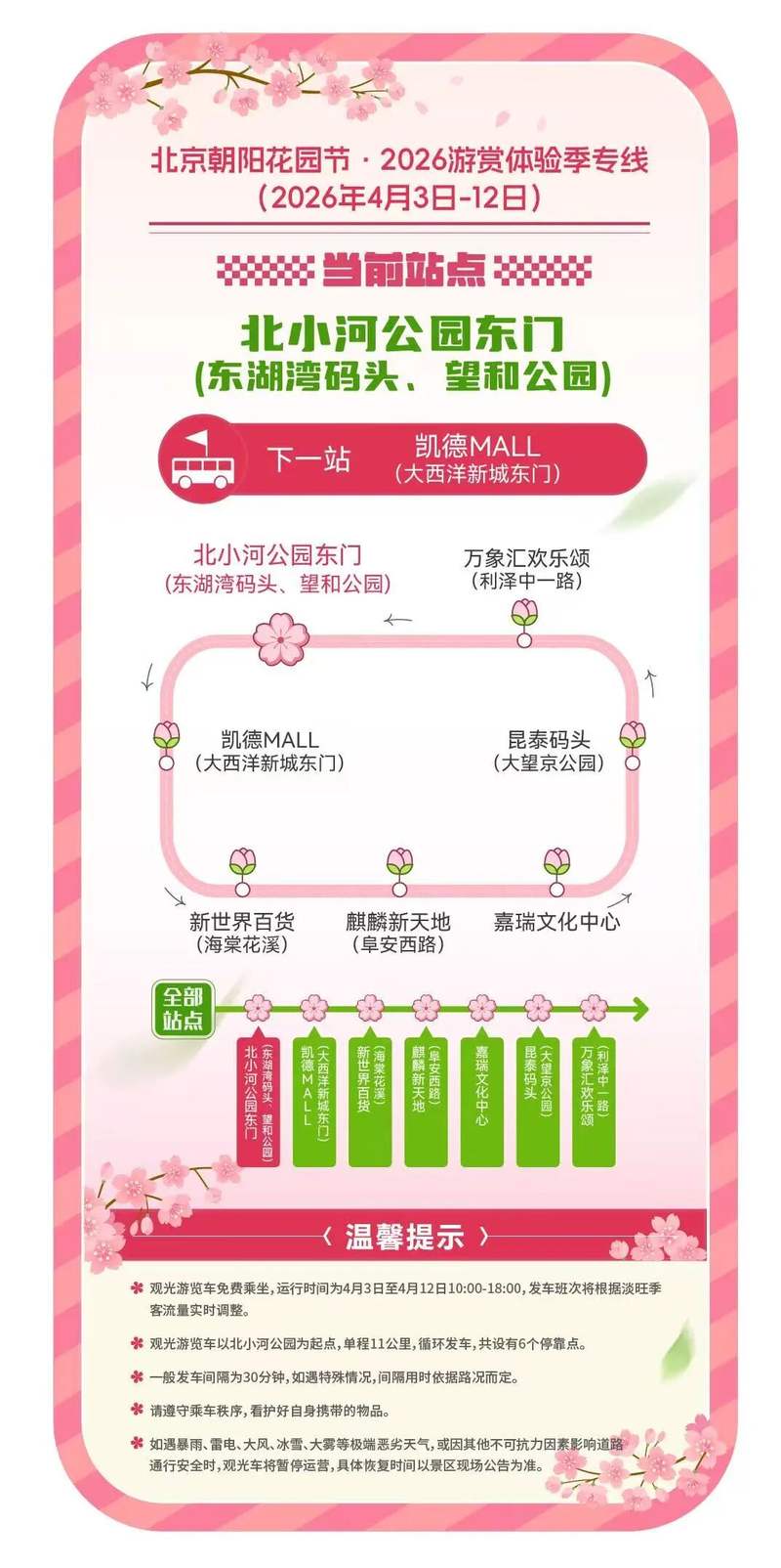 每日更新自由的!北京朝阳园林节樱花主题班车发车_新京报bet356体育官方网站打开 2026年4月4日2026年4月4日 新京报讯 据“北京朝阳”官方微信公众号消息,2026年北京朝阳园林节春醒出发旅游体验季于4月3日在北小河公园开幕。为给大家提供更加便捷舒适的赏樱之旅,北京公交集团第二客运分公司为大家运营了樱花主题的免费巴士。游客可以轻松欣赏花海。营业时间:4月3日至12日,上午10:00至下午6:00接驳路线:北小公园东门——凯德购物中心——新世界百货——麒麟新世界——嘉瑞文化中心——昆泰码头——万象 旅游编辑Joy刘梦洁