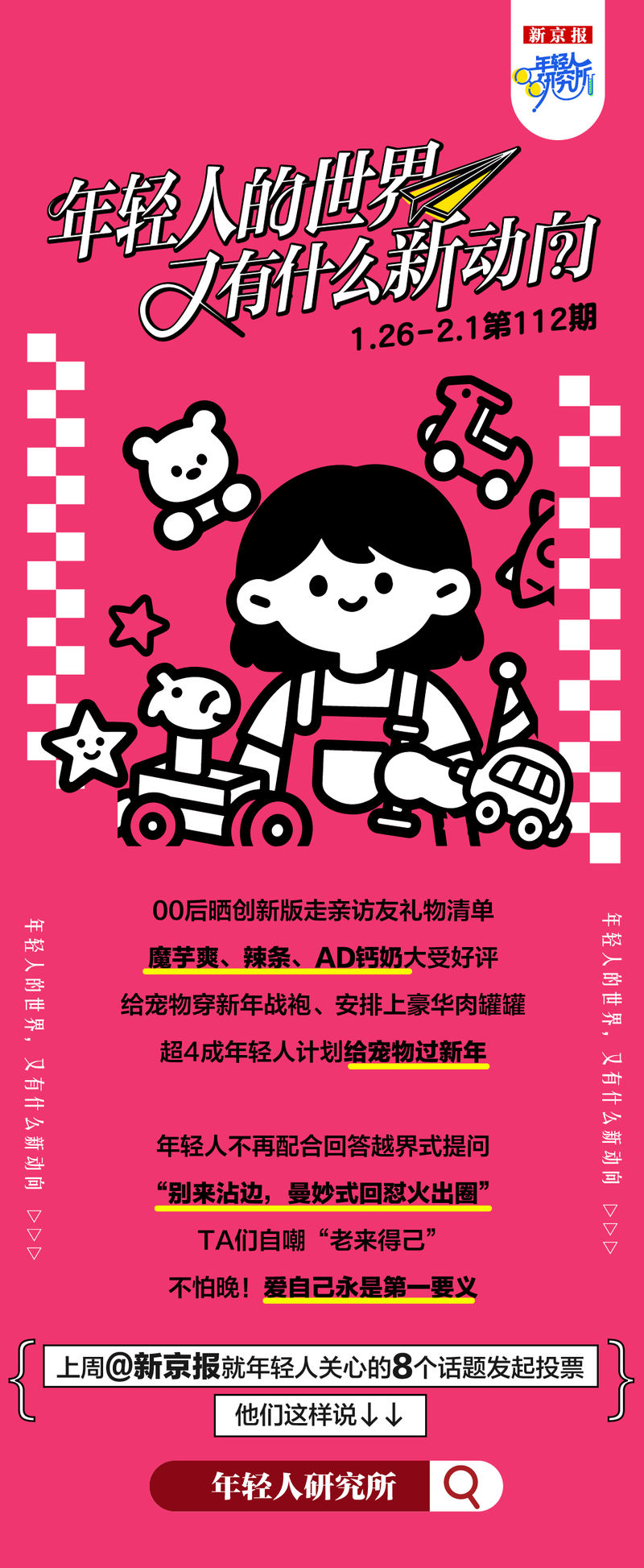 每日更新青年研究所112号admin打开 2026年2月7日2026年2月7日 2000 年代后的一代人发布了创新版本的拜访家人和朋友的礼物清单。蒟蒻、辣味丹渣、AD钙奶很受欢迎。这只宠物得到了一件新年T恤和一罐优雅的肉。超过40%的年轻人计划与宠物一起庆祝新年。年轻人在应对跨境问题时不再合作。爱自己应该永远是你的首要任务。上周@ShinjingJun针对年轻人感兴趣的八个话题发起了一项调查。他们是这样说的↓↓策划赵招聘编辑艾珍张玉和李世宇实习生胡蝶李翔设计卢子雄纠错杨莉